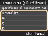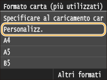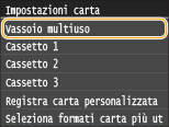 Dopo aver registrato l'impostazione predefinita per la carta, la schermata dell'impostazione non viene visualizzata quando si carica la carta, e viene utilizzata sempre la stessa impostazione. Se si carica carta di formato o tipo diverso senza modificare le impostazioni, la macchina potrebbe non stampare correttamente. Per evitare questo problema, selezionare <Specificare al caricamento carta> al passo 3, quindi caricare la carta.