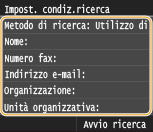 Nome, numeri fax, indirizzi e-mail, nomi di organizzazioni e unità organizzative sono criteri disponibili per la ricerca di destinazioni.