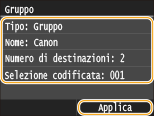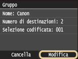 È possibile unire più selezioni in gruppi. È possibile registrare fino a 299 destinazioni (100 destinazioni per le e-mail) per un gruppo. Dopo la registrazione di un gruppo, è possibile modificarlo o eliminarlo.