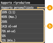 È possibile ingrandire o ridurre le copie utilizzando un rapporto di riproduzione predefinito come <A5->A4> o impostando un rapporto di riproduzione personalizzato con incrementi dell'1%.