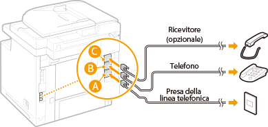Collegare il cavo telefonico incluso alla presa per linea telefonica sulla macchina (