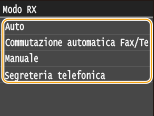 È possibile impostare la macchina per ricevere automaticamente i fax quando una chiamata in arrivo squilla per un intervallo di tempo specificato. Commutazione su RX automatica