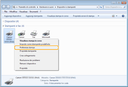 Fare clic con il pulsante destro del mouse sull'icona del driver fax per questa macchina, quindi fare clic su [Preferenze di stampa].