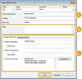 Immettere i numeri di fax. Se necessario è possibile separare i numeri con trattini. Se si desidera aggiungere spiegazioni degli usi dei numeri di fax, come "Casa" o "Ufficio", immetterle in [Descrizione].