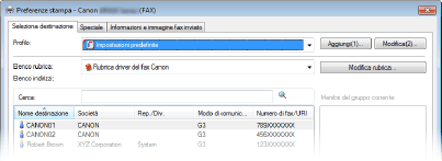 In questa sezione viene descritto come registrare le destinazioni nella Rubrica per i fax da PC. È possibile selezionare singole destinazioni tra quelle registrate nella Rubrica per creare una destinazione di gruppo (Selezione gruppo), utile quando si inviano fax a più destinazioni contemporaneamente.