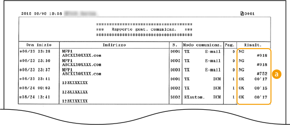 Quando viene visualizzato un codice di errore). Per le e-mail, i Rapporti gestione comunicazioni indicano il risultato di trasmissione tra la macchina e il server di posta, non tra la macchina e l'indirizzo di destinazione.