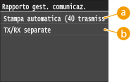Selezionare <On> per stampare separatamente i rapporti di invio e ricezione o <Off> per stampare entrambi i rapporti su un solo foglio.