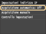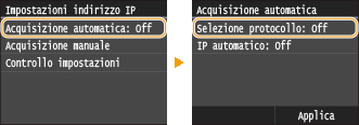 ![]() Se viene visualizzato <On>, toccare <Acquisizione automatica> e impostare sia <Selezione protocollo> e sia <IP automatico> su <Off>.