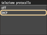 Toccare <Off>. Se si seleziona <DHCP> quando questi servizi non sono disponibili, la macchina sprecherà tempo e risorse di comunicazione nella ricerca di questi servizi nella rete.