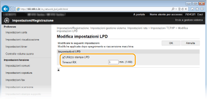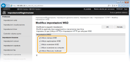 Selezionare la casella di controllo per ottenere informazioni sulla macchina da un computer tramite WSD. La casella di controllo viene selezionata automaticamente quando la casella di controllo [Utilizzo stampa WSD] è selezionata. [Utilizzo scansione WSD]