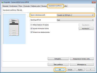È possibile utilizzare il driver stampante PCL6 così come l’UFR II. Le impostazioni di stampa disponibili variano a seconda del driver stampante. Per ulteriori informazioni, fare clic su [?] su ogni schermata del driver stampante.