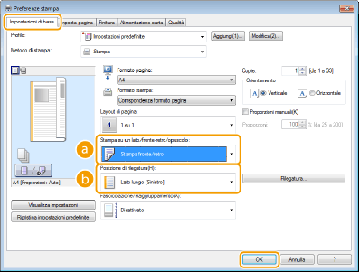 Selezionare [Stampa su un lato] oppure [Stampa fronte/retro] in [Stampa su un lato/fronte-retro/opuscolo]