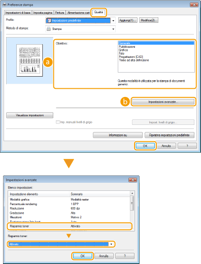 Nella schermata [Impostazioni avanzate], è possibile specificare diverse impostazioni di stampa, diverse da quelle di risparmio toner. Per ulteriori informazioni, fare clic su [?] nella schermata del driver stampante.