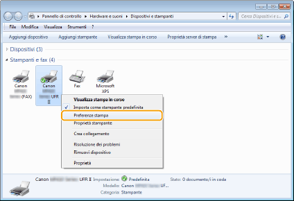 Fare clic con il pulsante destro del mouse sull'icona del driver della stampante per questa macchina, quindi fare clic su [Preferenze di stampa].