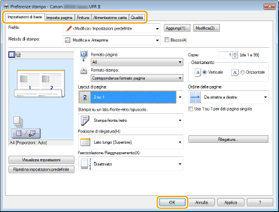 Fare clic sulle schede [Impostazioni di base], [Imposta pagina], [Finitura], [Alimentazione carta] o [Qualità] per specificare le impostazioni di stampa per ogni schermata, in base alle esigenze.