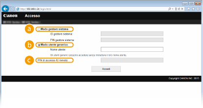 Selezionare [Modo gestore sistema] o [Modo utente generico], quindi immettere un valore in [PIN di accesso IU remota] se necessario.
