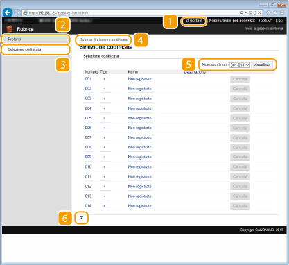 Visualizza i numeri a selezione codificata e l'elenco dei Preferiti registrati nella Rubrica. Se è stato effettuato l'accesso in modalità Gestore sistema, è inoltre possibile registrare o modificare la rubrica.