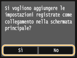 Se si seleziona <Sì>, viene visualizzato un messaggio. Leggere il messaggio e toccare <OK>. La combinazione di impostazioni registrata viene aggiunta alla schermata Schermata principale come pulsante di scelta rapida.