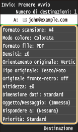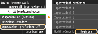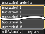 Per modificare o eliminare impostazioni registrate, passare a <Scansione>  <E-mail>/<I-Fax>/<File>  <Impostazioni preferite>  <Modif./Cancel.>  <Modifica> o <Cancella> e quindi attenersi alle istruzioni seguenti.