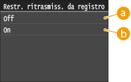 Impedisce di specificare destinazioni dai record di trasmissione. L'uso di questa restrizione impedisce la selezione di destinazioni dai record di trasmissione per "Invia fax", "Esegui scansione e invia via e-mail" e "Esegui scansione e salva in cartella condivisa o server FTP".