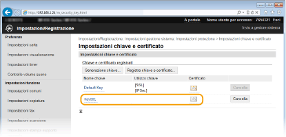 Una coppia di chiavi non può essere eliminata se viene attualmente utilizzata per un determinato scopo, ad esempio quando "[TLS]" o "[IEEE 802.1X]" sono visualizzati in [Utilizzo chiave]. In questo caso, disabilitare la funzione o sostituire la coppia di chiavi prima dell'eliminazione.