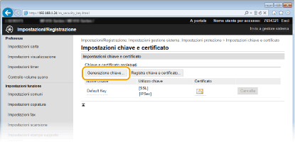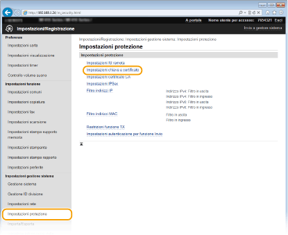 Fare clic su [Impostazioni protezione]  [Impostazioni chiave e certificato].