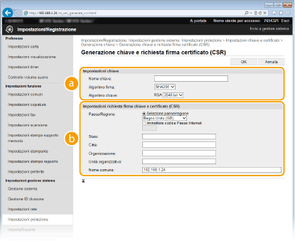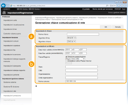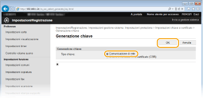 Quando è richiesta per la comunicazione tramite Transport Layer Security (TLS), è possibile generare una coppia di chiavi con la macchina. È possibile utilizzare TLS quando si accede alla macchina tramite la IU remota. Possono essere generare fino a cinque coppie di chiavi nella macchina (comprese le coppie preinstallate). I certificati autofirmati sono utilizzati con le coppie di chiavi generate in "Comunicazione di rete". Tramite una chiave e una richiesta CSR (Certificate Signing Request), è possibile richiedere un certificato digitale emesso da CA per la coppia di chiave generate dalla macchina.