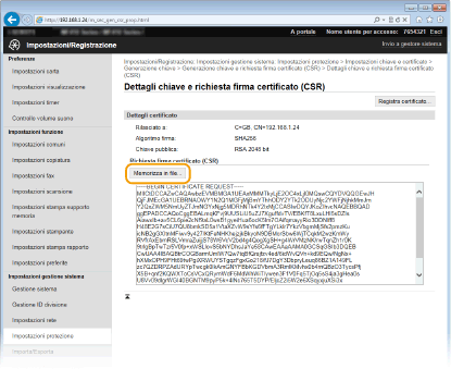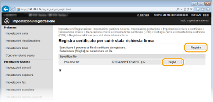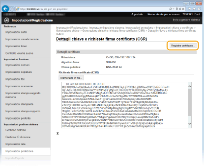 Non è possibile utilizzare la coppia di chiavi generate con la richiesta CSR (Certificate Signing Request) finché non viene registrato il certificato. Una volta che l'autorità di certificazione (CA) ha emesso il certificato digitale, provvedere a registrarlo attenendosi alla seguente procedura.