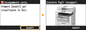 Se si verifica un inceppamento di carta, sullo schermo viene visualizzato <Inceppamento carta.>. Toccare <Avanti> per visualizzare una soluzione. *. Se le procedure visualizzate sullo schermo sono di difficile comprensione, vedere le sezioni seguenti per liberare la carta inceppata.
