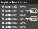 Se si verifica un errore, ad esempio quando la stampa non riesce o quando non è possibile inviare o ricevere un fax o un documento acquisito, il codice colore corrispondente viene visualizzato in un rapporto o nella schermata <Registro lavori> come numero di tre cifre. Verificare quanto segue per individuare cause e soluzioni per ciascun codice di errore. Per istruzioni su come stampare un rapporto di errore e sulle informazioni contenute nel rapporto, vedere