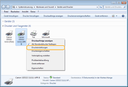 Klicken Sie mit der rechten Maustaste auf das Druckertreibersymbol dieses Geräts, und klicken Sie dann auf [Druckeinstellungen].