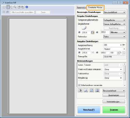 Wenn Sie auf die Registerkarte [Erweiterter Modus] des Bildschirms ScanGear MF klicken, können Sie umfangreichere Einstellungen der Bildqualität als im einfachen Modus vornehmen. Sie können auch erweiterte Einstellungen als "Bevorzugte Einstellungen" registrieren. Weitere Informationen erhalten Sie, wenn Sie auf das Symbol