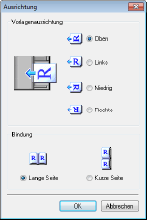 Wenn Dokumente in die Zufuhr eingelegt werden, legen Sie die Ausrichtung der Dokumente unter [Ausrichtung] fest. Sie können auch [Bindung] festlegen, wenn doppelseitige Dokumente in die Zufuhr eingelegt werden.