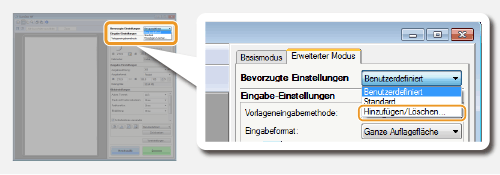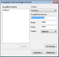 Wenn Sie [Hinzufügen/Löschen] auswählen, können Sie neue Ausgabeformateinstellungen hinzufügen und die hinzugefügten Formate löschen.