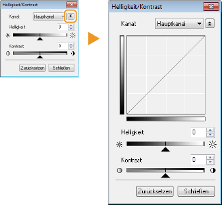 Diese Option passt die Helligkeit und den Kontrast (den Unterschied zwischen den hellen und dunklen Teilen) des Bildes an. Um die Anpassung mit der Überprüfung eines Diagramms vorzunehmen, klicken Sie oben rechts im Bildschirm auf