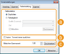 Der Bildschirm [ScanGear MF] wird automatisch geschlossen, nachdem der Scanvorgang beendet ist. Der Bildschirm wird bei einigen Anwendungen möglicherweise unabhängig von dieser Einstellung automatisch geschlossen.