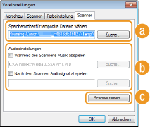 Sie können Musik oder Signaltöne einstellen, die während des Scanvorgangs oder beim Abschluss des Scanvorgangs wiedergegeben werden. Klicken Sie auf [Suche], um eine wiederzugebende Datei auszuwählen. Die folgenden Dateiformate (Erweiterungen) werden unterstützt: