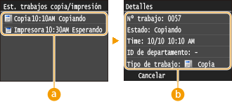 ![]() <Est. trabajos copia/impresión>Muestra una lista con los documentos que se están copiando, procesando o en espera de ser procesados.