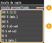 <Copia>  <Escala de copia>  Seleccione la escala de copia