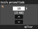 Pulse / o las teclas numéricas para introducir la escala de copia, y pulse <Aplicar>. Podrá establecer cualquier escala de copia entre el 25% y el 400% en incrementos del 1%.