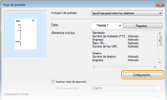 Muestra los elementos que van a incluirse en una hoja de portada. Para cambiar los elementos que desee incluir, haga clic en [Configuración].