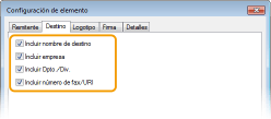 Seleccione los elementos de destino que desee incluir e introduzca la información. Los nombres de destinos, los nombres de empresas, los nombres de departamentos y los números de fax especificados en la pestaña [Seleccionar destino]/[Introducir destino] (