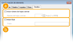 Marque esta casilla de verificación si desea incluir el número de hojas que va a enviar en la portada y especifique el número de hojas en [Número de hojas a enviar]. El número de hojas que desea enviar no se contabiliza automáticamente. El valor especificado aquí se incluye en la portada.