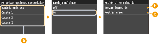 Si la configuración del controlador de impresora no coincide con el tamaño y el tipo de papel cargado con <On> seleccionado, podría producirse un atasco de papel o un error de impresión.