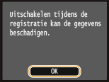 De registratie wordt gestart. Wacht totdat de melding <Installatie voltooid. Instellingen van kracht nadat de hoofdschakelaar UIT en AAN is gezet.> wordt weergegeven.