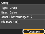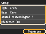 U kunt meerdere bestemmingen samenvoegen in groepen. U kunt maximaal 299 bestemmingen (100 bestemmingen voor e-mail) voor een groep registreren. Wanneer een groep is geregistreerd, kunt u deze bewerken of verwijderen.