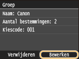 Na het opslaan van bestemmingen in een groep kunt u de inhoud van de opgeslagen informatie wijzigen. U kunt bijvoorbeeld de groepsnaam of het kiescodenummer veranderen, bestemmingen toevoegen / verwijderen, enzovoort.