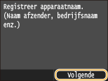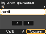 Voer met behulp van de numerieke toetsen de naam van het apparaat in (zoals een gebruikersnaam of bedrijfsnaam) en tik op <Toepassen>.