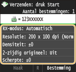 U kunt tot wel 18 veelgebruikte combinaties van faxinstellingen registreren. U kunt geregistreerde instellingen snel weergeven, wanneer dat nodig is, zodat u niet iedere keer instellingen hoeft te maken, zoals 'een tweezijdig origineel scannen, verzenden naar 5 bestemmingen, scherpte instellen'. Ook kunt u instellingen weergeven als knoppen met snelkoppelingen in het scherm Start.