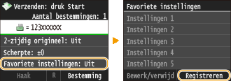 Om geregistreerde instellingen te bewerken of te wissen, gaat u naar <Faxen>  <Favoriete instellingen>  <Bewerk/verwijd>  <Bewerken> of <Verwijderen> en volgt u de onderstaande stappen.